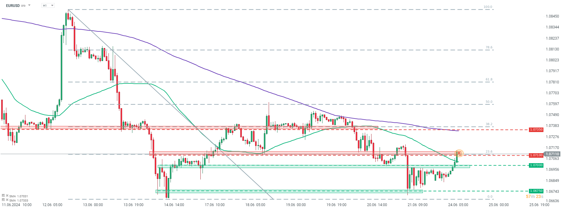 EURUSD ticked lower after German IFO data release but remains within the short-term 1.0710 resistance zone. Source: xStation5