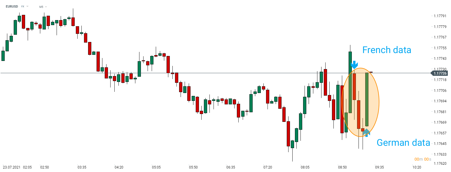EURUSD dropped following French PMIs. However, the pair recovered after solid German print. Source: xStation5