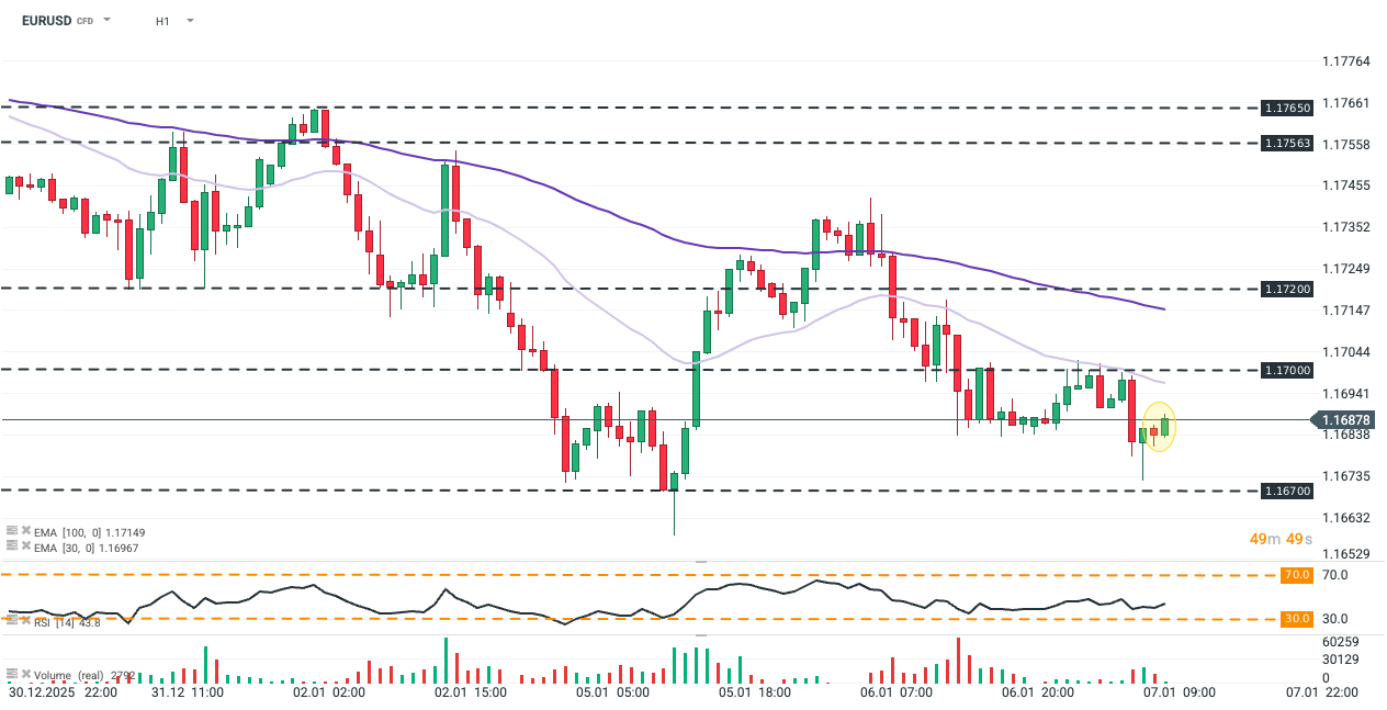 EURUSD progressively recovers from selling in the early European trading. The pair remains under a significant selling pressure, currently unable to recover above both 30-hour exponential moving average (EMA30; light purple) and psychological level of 1,17000.