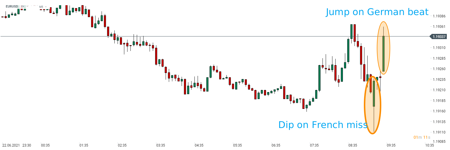 EURUSD dipped after French PMIs but jumped after German beat. Source: xStation5