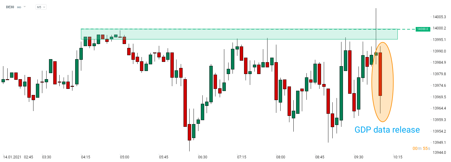 DE30 pulled back in spite of slightly better-than-expected GDP data for 2020. However, scale of reaction was small. Source: xStation5