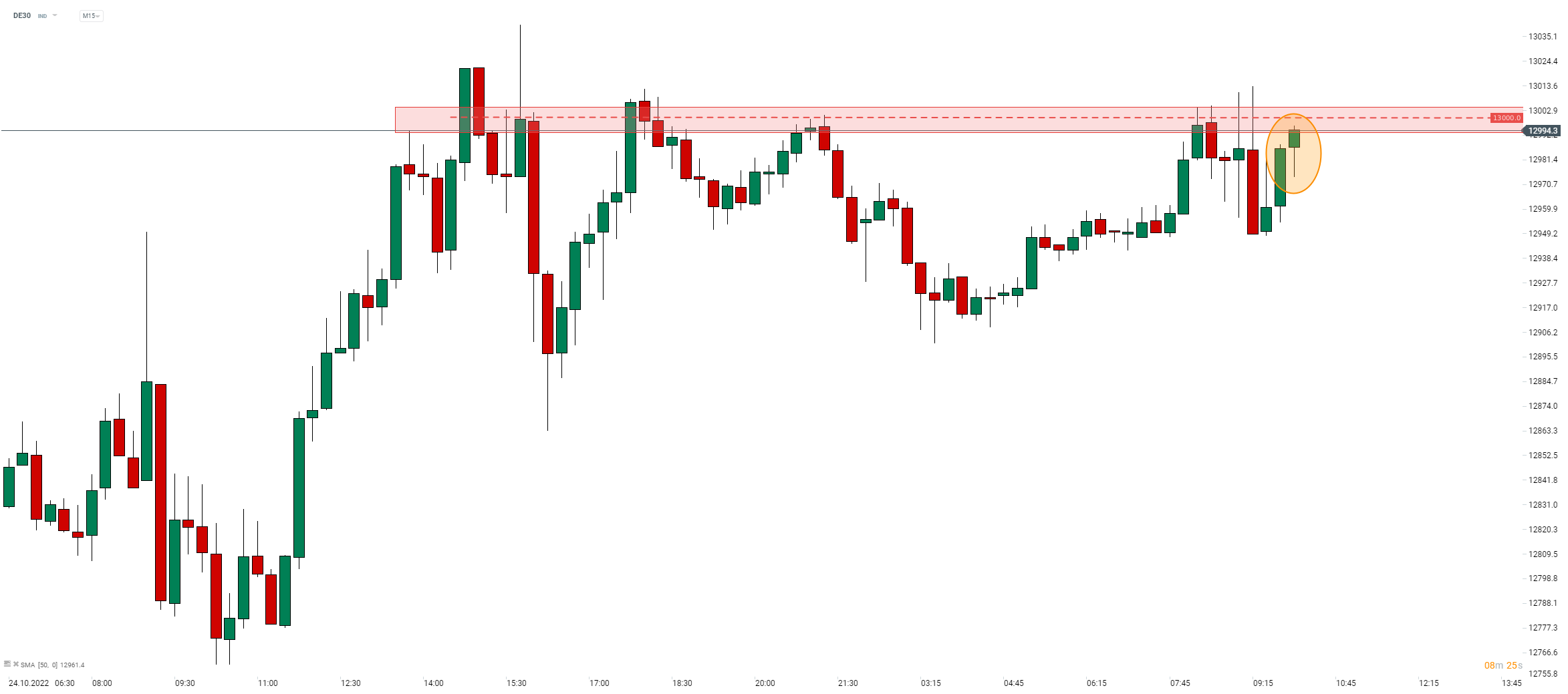 DE30 failed to see any major move in the aftermath of Ifo indices release. Index continues to trade a touch below a psychological 13,000 pts area but another attempt to break above looks likely. Source: xStation5