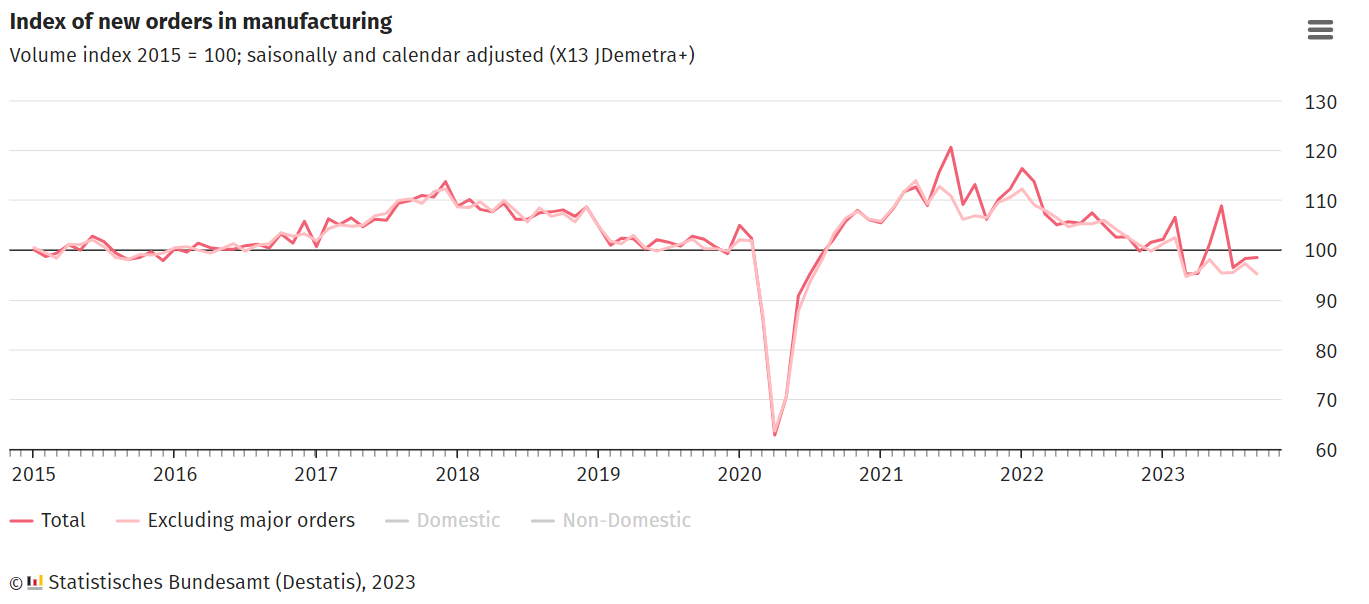 In September 2023, real new orders in manufacturing increased by 0.2% compared to the previous month, after adjusting for seasonal and calendar effects. However, when compared to the same month in the previous year, there was a 4.3% decrease. In August 2023, there was a significant revision, with new orders increasing by 1.9% compared to July 2023, mainly due to incorrectly reported data in the 'manufacture of computer, electronic, and optical products' sector.
