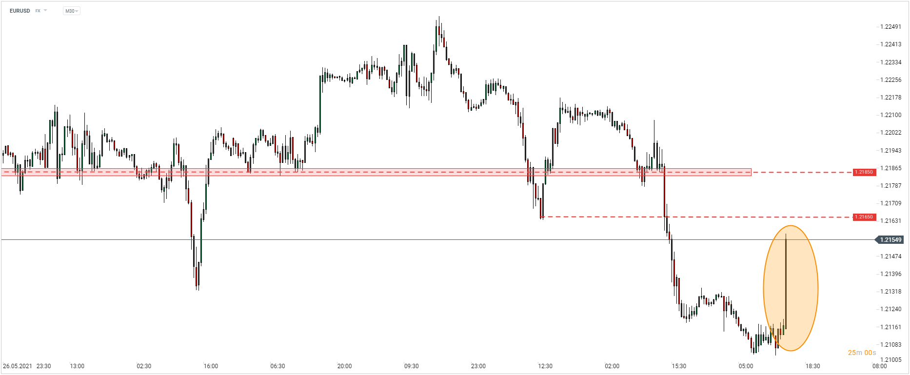 As one can see, the report not only failed to confirm ADP estimates but also failed to meet market expectations. Last month's reading was revised higher from 266k to 278k. When it comes to market reaction, European indices and US equity futures jumped in a knee-jerk move. US dollar took a hit with all major currencies gaining against the greenback. EURUSD jumped from around 1.2116 to above 1.2150.
