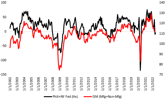 Not a rosy picture. Philly Fed + NY Fed indicators remain negative for the second straight month, heralding a slide in ISM into contraction territory. Source: Macrobond, XTB Research