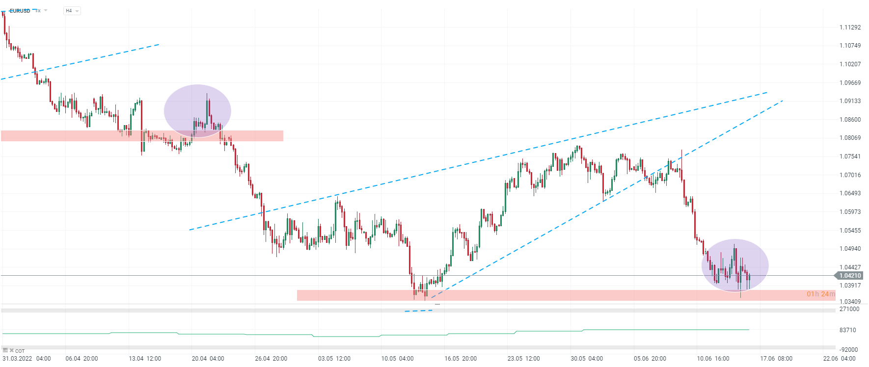 This shows clearly weakening economy even ahead of the major tightening from the Fed, contrasting the message from Chairman Powell that the US economy was well positioned to face significant tightening. While an immediate reaction to the data is minor, it compounds the challenge for the central bank and this challenge (that might result in a recession) is the main reason why the US500 is already 1100 of the 21 ATH.