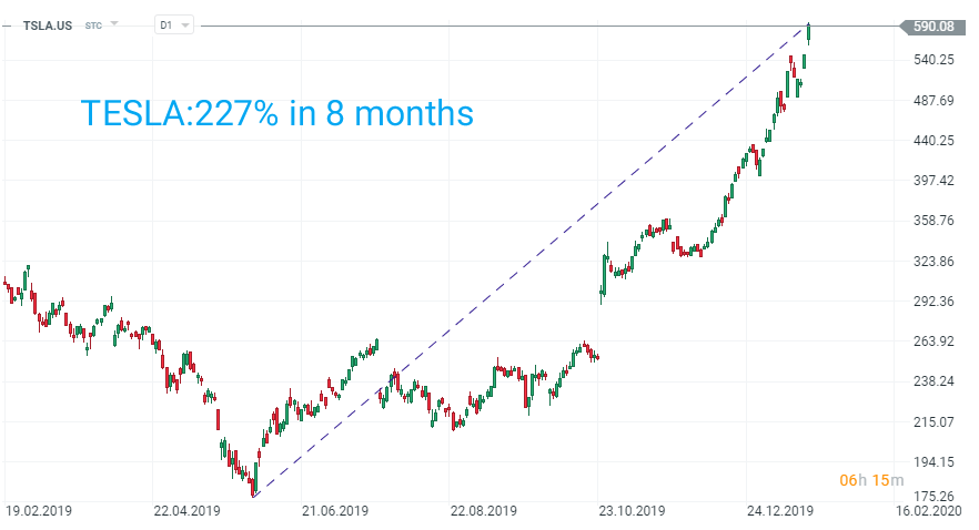 Elon Musk might still be some years away from sending people to Mars but a stock price of his Tesla surging like a SpaceX rocket. The stock (TSLA.US) is more than 8% today, more than 40% in January so far and nearly 230% up from 2019 lows!!! Tesla is already worth more than all global carmakers except Toyota, despite selling less than 5% cars compared to the Japanese carmaker or the VW group. Today we got the news that Tesla is finally able to sell cars in Michigan state but it seems like it’s slaughtering of short sellers that’s behind this buying frenzy. Suddenly, the quarterly report from the company is shaping up to be the most important event in Janaury. It will be published next week (January 29).
