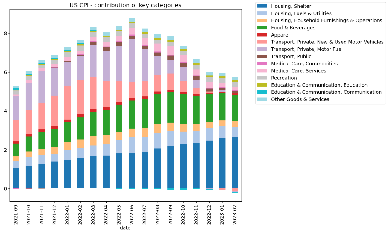 Small year-on-year declines on the side of fuels or energy carriers in housing. Without major declines on this side, we may see a "plateau" in the 5-6% range. Source: Macrobond, XTB