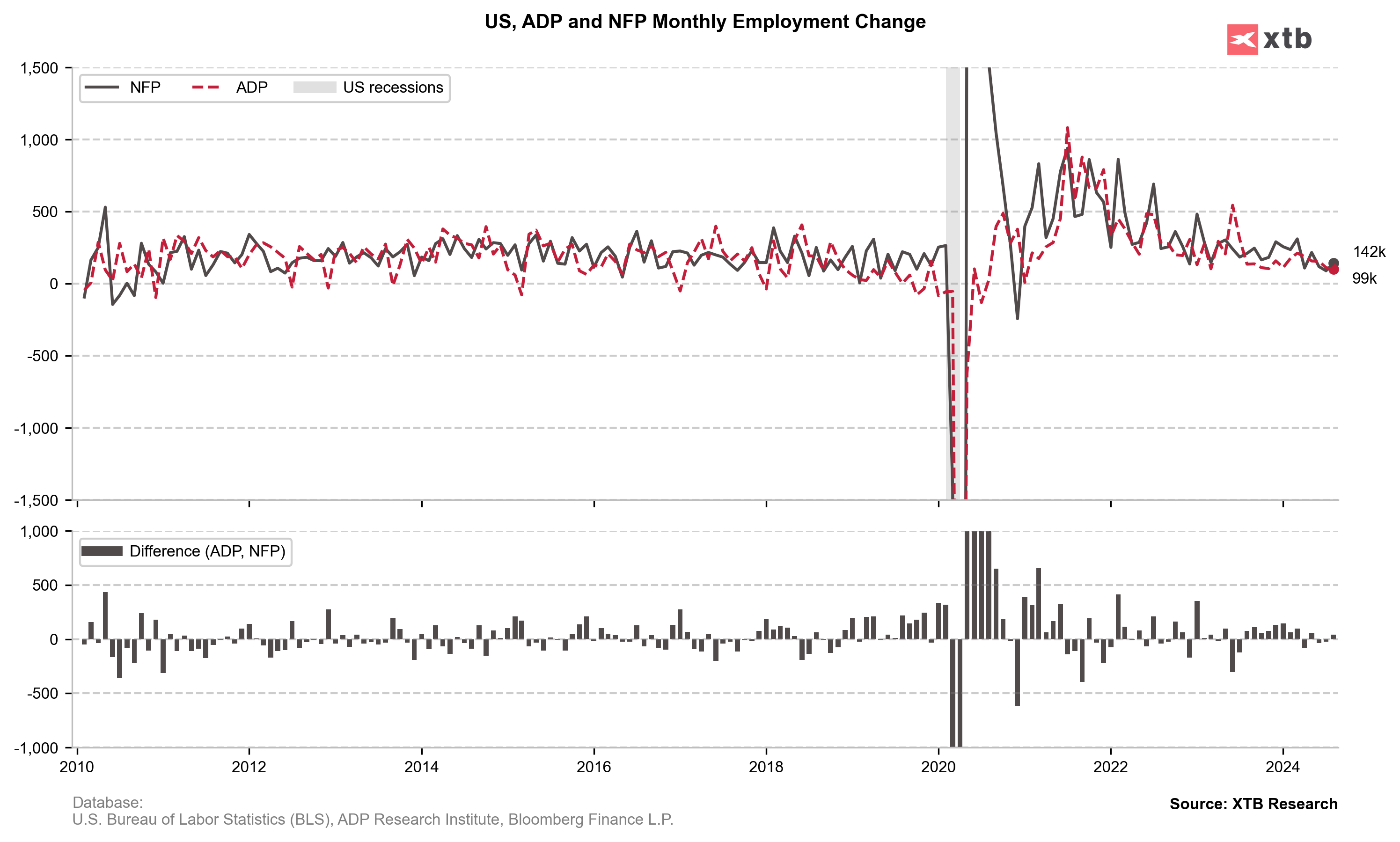 Source: BLS, ADP Research, Bloomberg Finance L.P, XTB Research