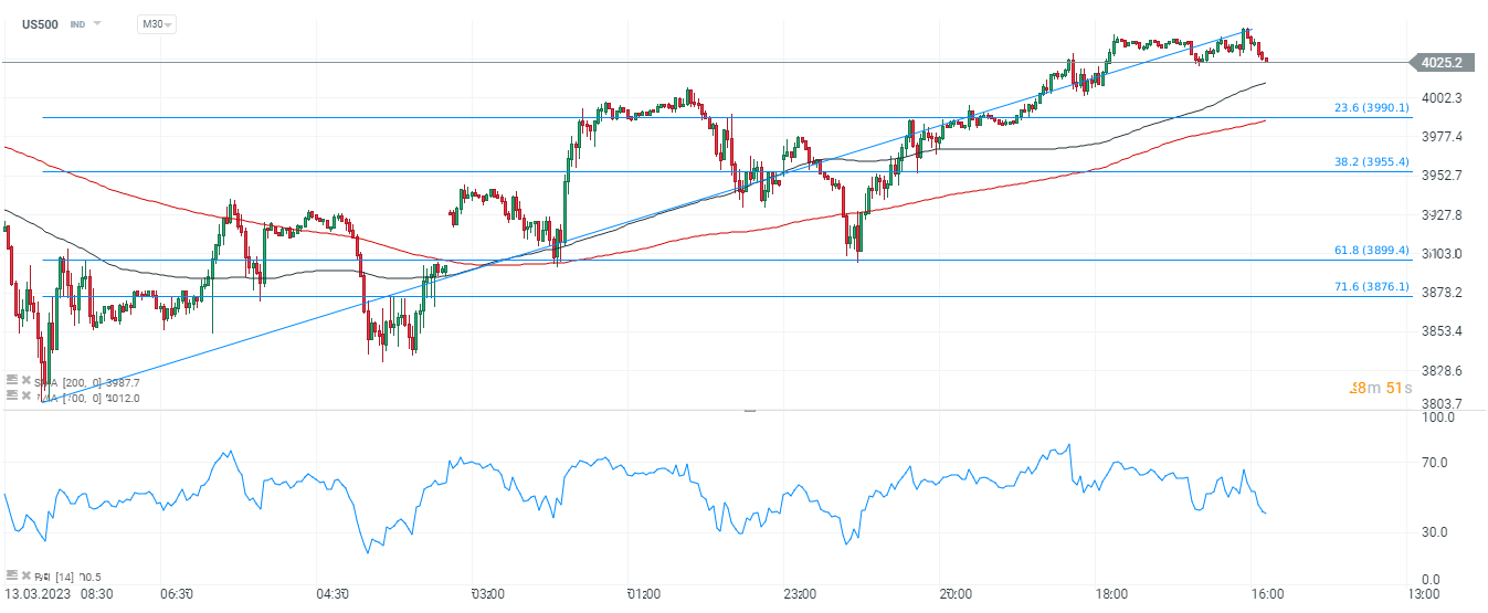 Sentiment on the US500 worsened after media reports according to which European Central Bank officials are increasingly convinced that the eurozone banking system has survived the financial turmoil. This would allow the bank to resume interest rate hikes. Faith in the Fed's premature pivot appears to be waning. The stocks of major U.S banks are still under downward pressure, signaling that the mood in the financial industry remains tense.An overly hawkish Fed could potentially exacerbate stock declines in banking sector.