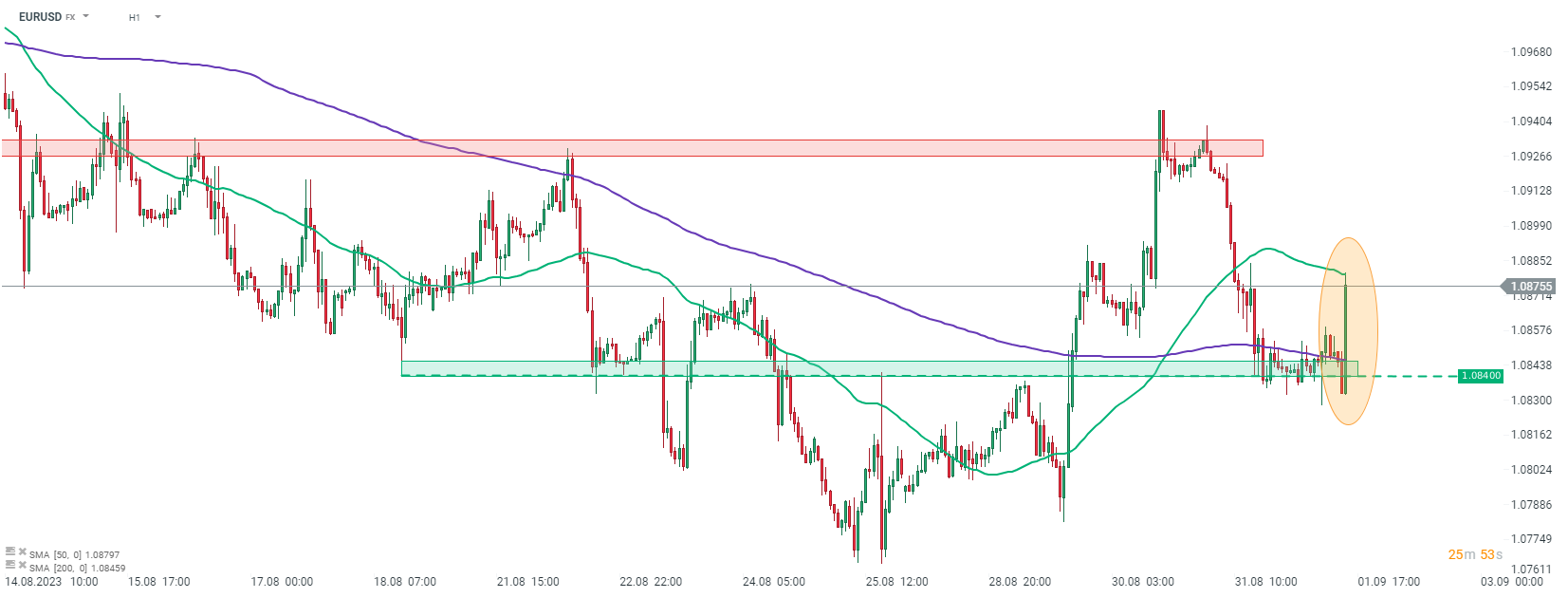 EURUSD surged following NFP data and tested 50-hour moving average (green line). Source: xStation5