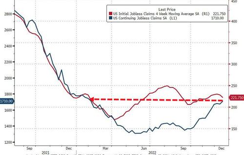 Today's report showed that 1.710 million US citizens are filing for jobless claims on a continuing basis, a level not seen since early February 2022. Meanwhile 4-week average was little changed. Source: Bloomberg via ZeroHedge