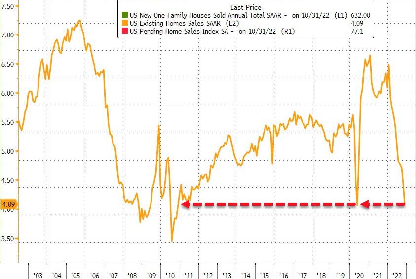 Existing home sales continue to move lower sharply, which is another recession warning signal. Source: Bloomberg via ZeroHedge