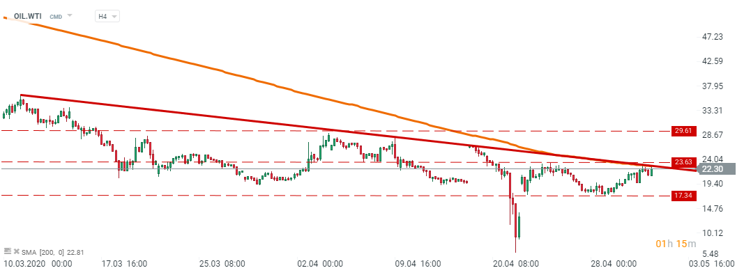 OIL.WTI is testing major resistance level at $23.63 per barrel which is additionally strengthen by 200 MA (orange line) and downward trend line. If buyers manage to break above it, an upward impulse towards $29.61 per barrel could be launched. On the other hand, once sellers regain control, the support at $17.34 per barrel may be at risk. Source: xStation5