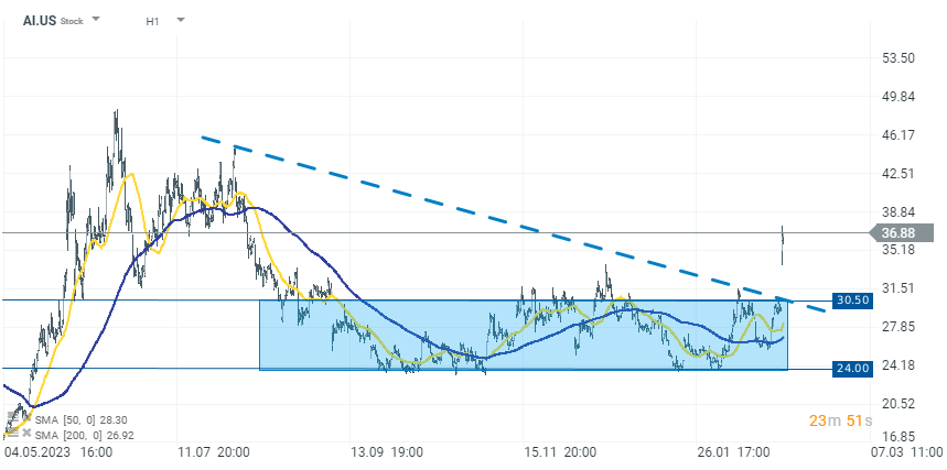 C3.ai shares are rising today by over 24% to $36.90 per share, breaking above the recent consolidation zone below the $30.50 level. Source: xStation 5