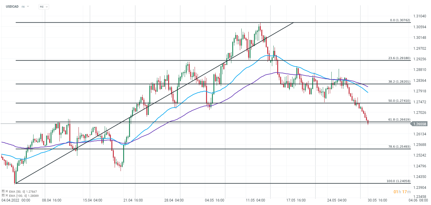 The USD/CAD pair loses over 0.5% today and goes below the 61.8% Fibo retracement of the upward wave initiated at the beginning of April this year. Source: xStation 5
