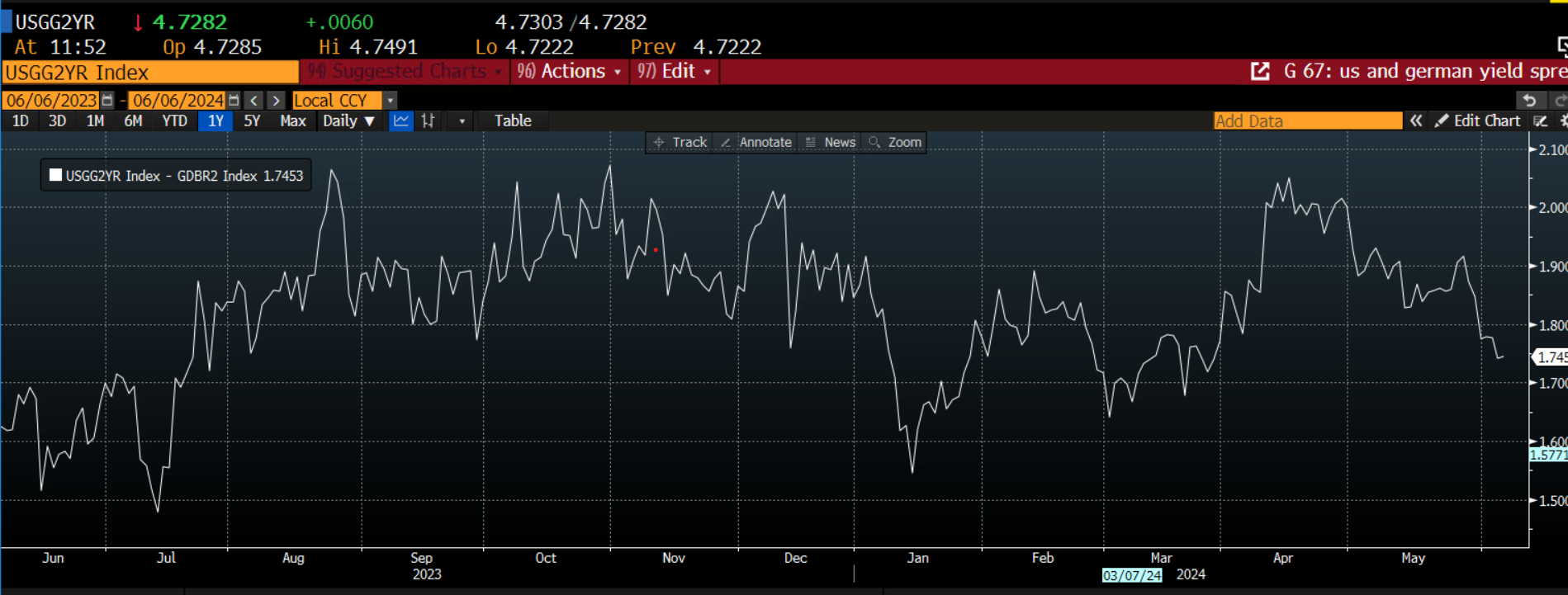 This contrasts with the Eurozone, where inflation and growth has been surprising on the upside. The contrasting fortunes of the US and the Eurozone is reflected in the spread between US and German 2-year bond yields, as you can see below. This spread has been narrowing, as German 2-year yields have been rising at a faster pace than US 2-year bond yields, and the spread is now at its narrowest level since last March.