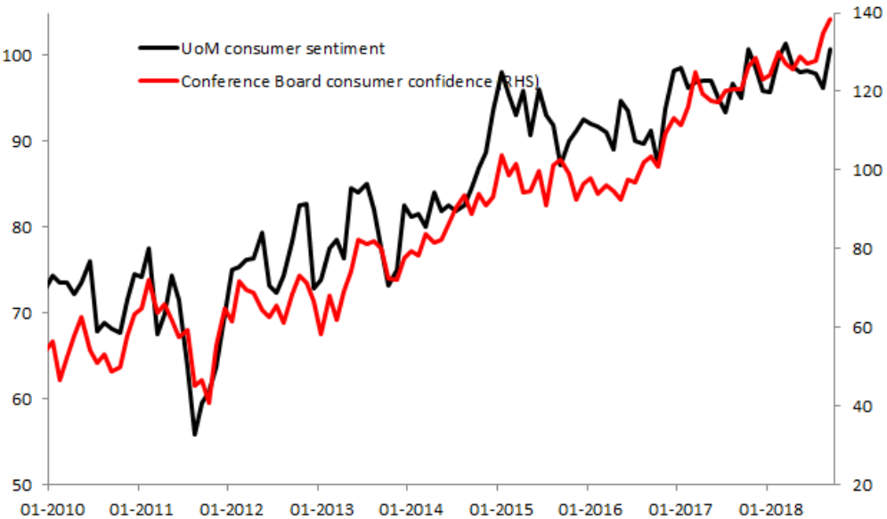 The most recent data on US consumer spending suggests this economic indicator is in rude health with a standout print, but it has seen a fairly muted reaction in the markets with the buck remaining a little lower on the day. The Conference Board consumer confidence index rose to its highest level since September 2000 in coming in at 138.4, well above the 132.2 expected and the prior reading was also revised higher for good measure (now 134.7 vs 133.4 previously). It’s not just the CB number that is surging higher of late with the Uni Mich equivalent also rising in recent months and taken together they give the impression that the US consumer is in a very confident mood at present.