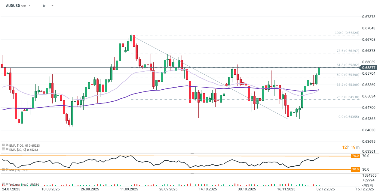AUD also got some additional support from higher than expected services PMI in China (52.1 vs 52 expected). The country's services sector expanded in November, but growth slowed slightly (previously: 52,6). New orders and export demand improved, supported by easing Sino-US trade uncertainty, yet employment continued to contract and profit margins remained under pressure. Input costs rose for the ninth month, while firms’ future activity expectations weakened, highlighting ongoing challenges.