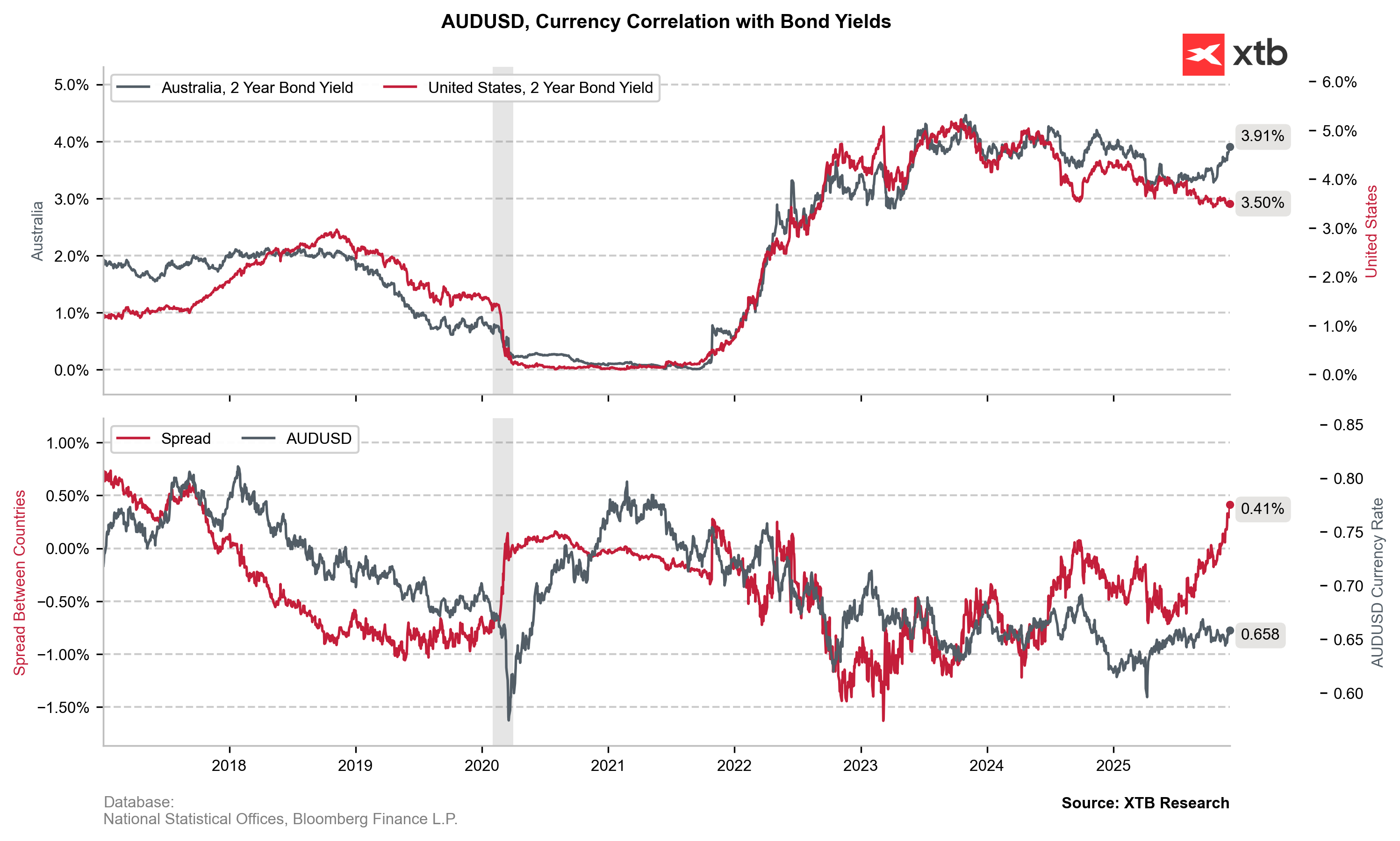 The spread between Australia and US 2-year bonds surged to its highest since late 2017 over last month. Source: XTB Research, Bloomberg Finance LP
