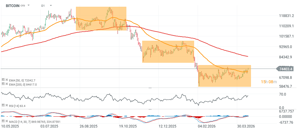 Bitcoin’s move back above $74,000 looks like a genuine relief rally, but not one investors should treat as a confirmed breakout. What we’re seeing is a broader return of risk appetite, helped by a softer geopolitical tone around Iran and the Strait of Hormuz. That shift was enough to pull capital back into crypto, equities, and other higher-beta assets. Still, this remains a headline-driven market, so the rebound looks constructive—but not fully secure.