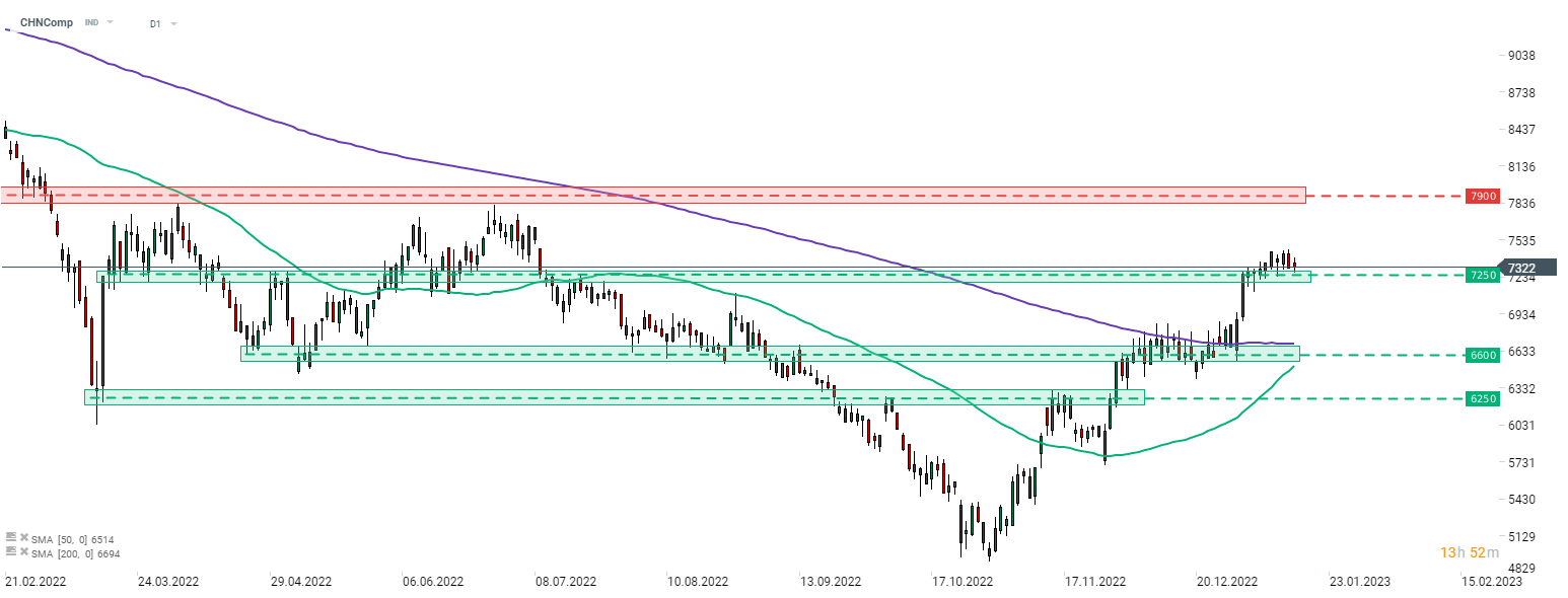 While beats in the data are always welcome, Chinese stock market indices did not reflect any optimism and finished today's trading lower. Some analysts already noted that not everything seems right in the data. UBS pointed that a 2.9% YoY GDP growth in Q4 2022 would more likely point to full-2022 GDP growth being below 2%! Moreover, the Chinese National Bureau of Statistics said that the population of China dropped by 850k in 2022 - the first annual population drop since 1961!
