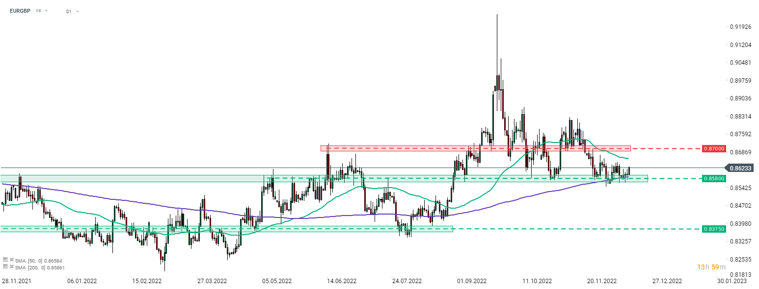 Taking a look at EURGBP at D1 interval, we can see that the pair attempted to break below the 0.8580 support zone, marked with a 200-session moving average (purple line), but failed to do so. Pair is bouncing off the zone today and is expected to become much more volatile in the early afternoon when BoE and ECB announce their rate decisions. Should we see a hawkish surprise from ECB, the pair could spike towards the resistance zone in the 0.8700 area, especially if BoE delivers dovish surprise as well.
