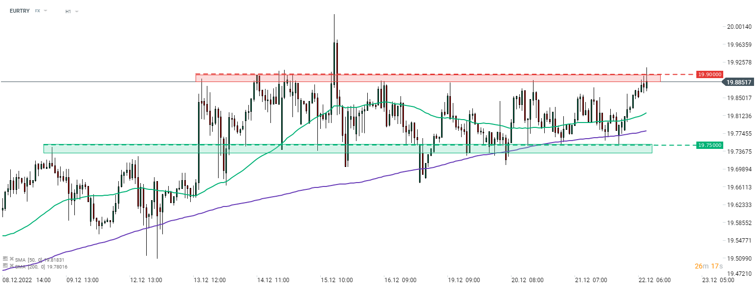 Central Bank of the Republic of Turkey is set to announce its final rate decision of 2022 today at 11:00 am GMT. CBRT is expected to leave the main one-week repo rate unchanged at 9.00% at today's meeting. This comes after 4 rate cuts in a row with the latest one being 150 bp cut in November. Bank is under significant political pressure to cut rates and continues to look past an over-80% inflation rate. Holding rates unchanged today could give investors' some comfort and see TRY gain. However, another cut could add to TRY woes and see EURTRY jump above the upper limit of trading range.