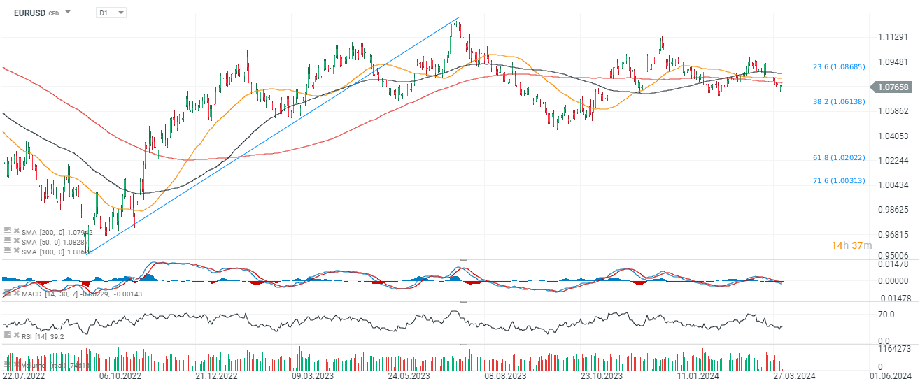 Today, the Eurodollar saw increased volatility following the release of data from the Eurozone economy. The euro weakens after data indicated that preliminary eurozone CPI inflation for March came in below expectations at 2.4% versus 2.5% forecasts. The core CPI also settled below the 3% estimate, and the unemployment rate rose 0.1% to 6.5%. Overall, the data suggest an economic slowdown in Europe, and dovish comments from the ECB's Holzmann, indicate that keeping the ECB deposit rate above 3% may prove too restrictive given the current economic climate. Data from the U.S. continues to perform very solidly against the eurozone, and today the gap is likely to be widened when we learn ISM service sector data (3 PM GMT) and the ADP report from the U.S. private labor market (1:15 PM GMT). In both cases, the market expects readings slightly better than in February. A strong ADP employment change and ISM above 53 points could strengthen the dollar and put downward pressure on EURUSD. In addition, as many as 5 members of the Federal Reserve will speak today, including Jerome Powell (5:10 PM GMT)