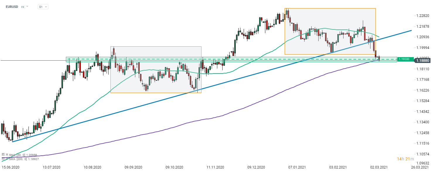 US dollar is trading higher against most major peers at the beginning of a new week. USD is being supported by risk-off moods seen outside of Europe, especially on Nasdaq futures, as well as another jump in yields with 10-year yields trading just slightly below 1.6%. EURUSD continues to move lower following a break below the upward trendline and the lower limit of the Overbalance structure last week. The pair is attempting a break below the 1.19 zone, that is additionally being strengthened by the 200-session moving average. EURUSD has reached a daily low near 1.1880 - the lowest level since late-November 2020. In case we see a meaningful break below the 1.19 zone, downward move may deepen towards the next support at 1.1715 - the lower limit of the August-September 2020 trading range.