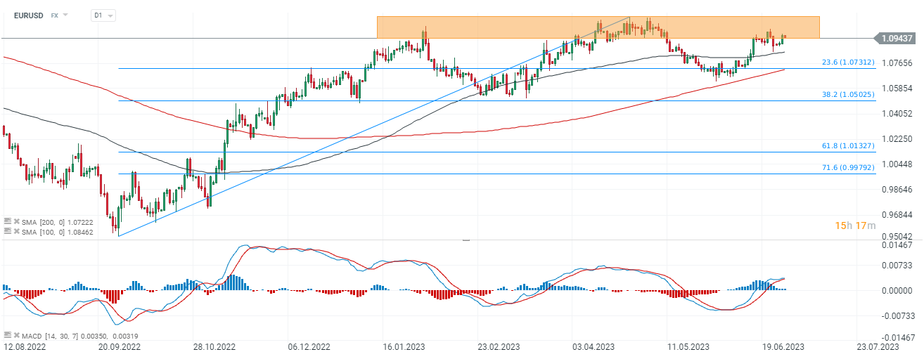 Lagarde communicated yesterday that a 25bp hike in July is almost certain - there is little chance she would surprise the market with anything today. Powell, on the other hand, did not speak for a bit longer, and yesterday's strong macro readings may prompt the Fed chief to maintain a rather hawkish stance. Although the Fed is arguably closer to the end of the cycle than the ECB, which has reacted belatedly to inflation, data from EMU has been much weaker than readings from the US. This could mean that a hawkish turn in the ECB's ultra-dovish policy (unlike the Fed, ECB rates have not been raised from 2009 to 2022 except in 2011) could ultimately cost Europe more economic stress from higher rates (highest since 2001). The market seems unsure whether the economy can withstand the cycle with as much force as it has so far in the US. Yesterday's macro data from the US turned out to be surprisingly strong.