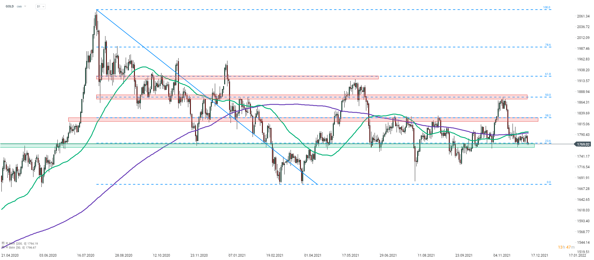 This is the baseline ahead of today's meeting and any market moves will depend on direction as well as scale of deviation from expectations. Should we see dot-plot unchanged with median pointing to a single rate hike next year, USD may weaken while gold and equities should benefit. Taking a look at the GOLD chart at the D1 interval, we can see that the price has been struggling to deliver a bigger move in either direction in recent weeks. Gold traded sideways with 200-session moving average (purple line) acting as resistance and 23.6% retracement of the August 2020 - March 2021 downward move ($1,770). Price has been respecting retracements of the aforementioned downward move therefore in case of a break above the aforementioned 200-session moving average, bulls attention will shift to resistance marked with 38.2% retracement ($1,830).