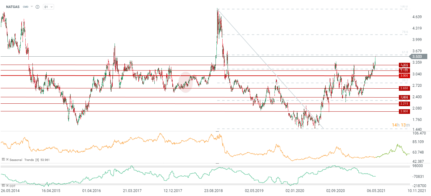 NATGAS hit the highest level since January 2019. Interestingly, seasonal patterns hint that we may be observing a local low. Speculative positioning is negative. A significant backwardation can be spotted on the natural gas market therefore rollovers will push prices lower. Significant short-term demand can be spotted on numerous commodity markets. Source: xStation5