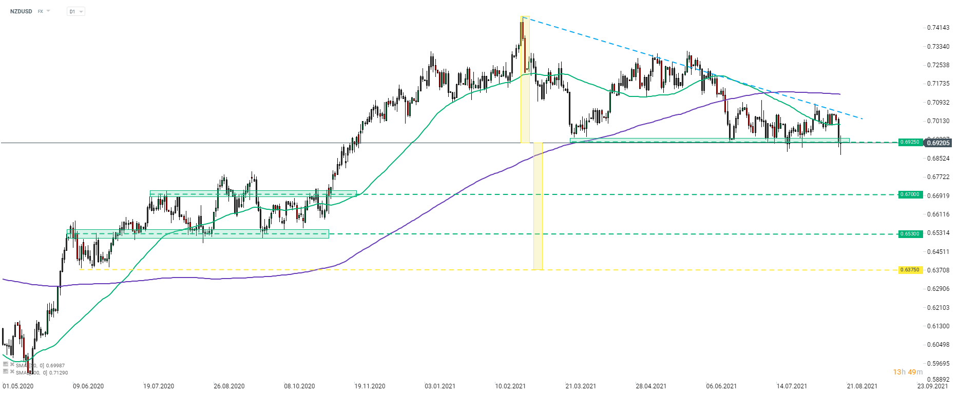 The Reserve Bank of New Zealand left rates unchanged at today's meeting. RBNZ ended its QE programme in July and was expected to begin a rate hike cycle today. However, as New Zealand headed into a fresh nationwide lockdown, central bankers decided to stay on hold and wait to see how the situation develops. Nevertheless, it should be seen more as a brief pause rather than a big shift. Projections released by the RBNZ showed that the Bank still expects at least one 25 basis point rate hike this year followed by 4 rate hikes in 2022 (100 basis points). The New Zealand housing market is running hot and inflation is accelerating therefore RBNZ sooner or later will need to hike rates in order to avoid overheating the economy. Next RBNZ meeting is scheduled for October 3 and should the new Delta variant outbreak be contained quickly, central bankers from New Zealand may push forward with a rate hike then.