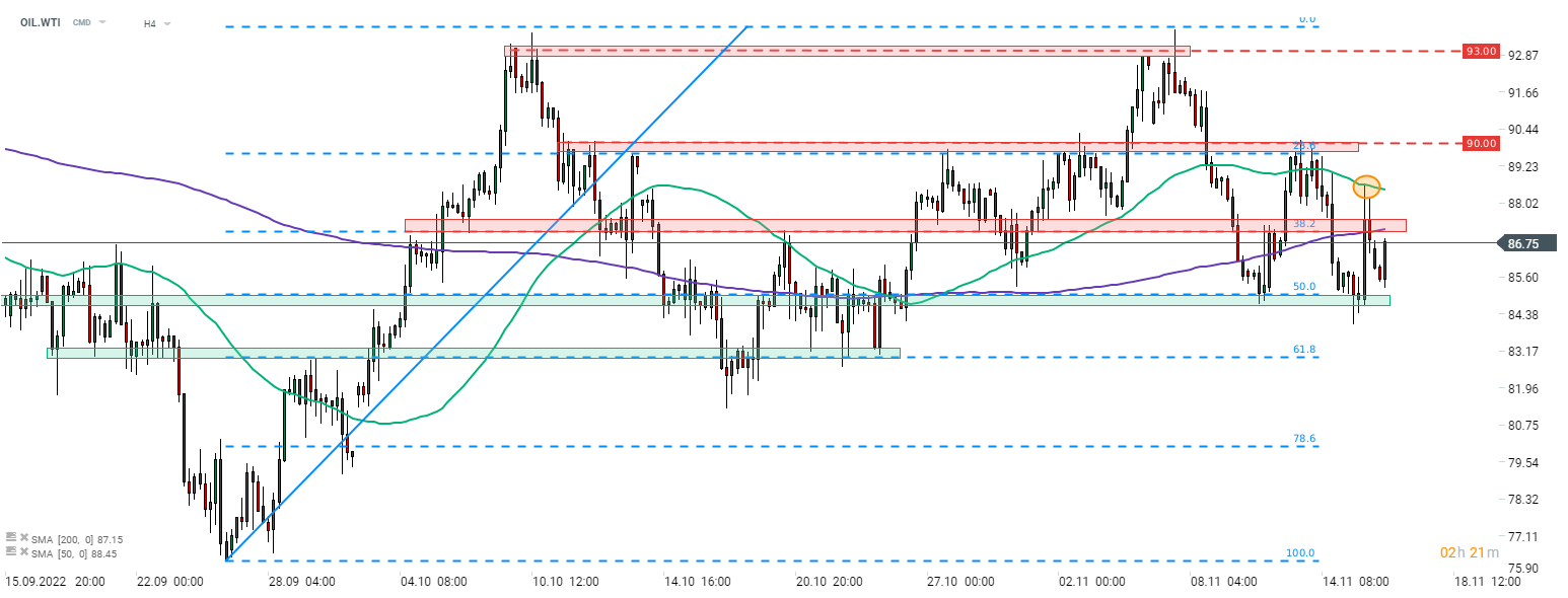 Taking a look at OIL.WTI chart at H4 interval, we can see that the price jumped yesterday in the afternoon and broke above the resistance zone marked with 38.2% retracement and a 200-session period moving average (purple line). Advance was halted at the 50-period moving average (green) and OIL.WTI started to erase gains later on. Price pulled back below the aforementioned 38.2% retracement and moved towards $85 per barrel handle. However, an attempt to launch another upward impulse can be spotted today following reports of a drone strike on an oil tanker off the coast of Oman.