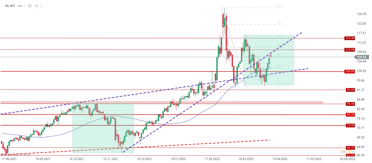 Oil gained about 1% at the open today, but just before the standard start of the European session (still almost all markets are closed), the price is just above the closing from last week. Last week on Thursday, the price was up almost 2.5%, and for the whole week, the price was up almost about 8%. Technically, we can see a failed breakout through resistance at the Fibo 38.2 retracement for WTI crude oil. Short-term support during today's session can be determined at $105. More important support is located at $101 along with the 23.6 retracement, while bulls will continue to target the area around the 50.0 retracement and the $110 per barrel level. Additionally, further gains may be limited by the previous uptrend line, which may act as resistance at the moment.