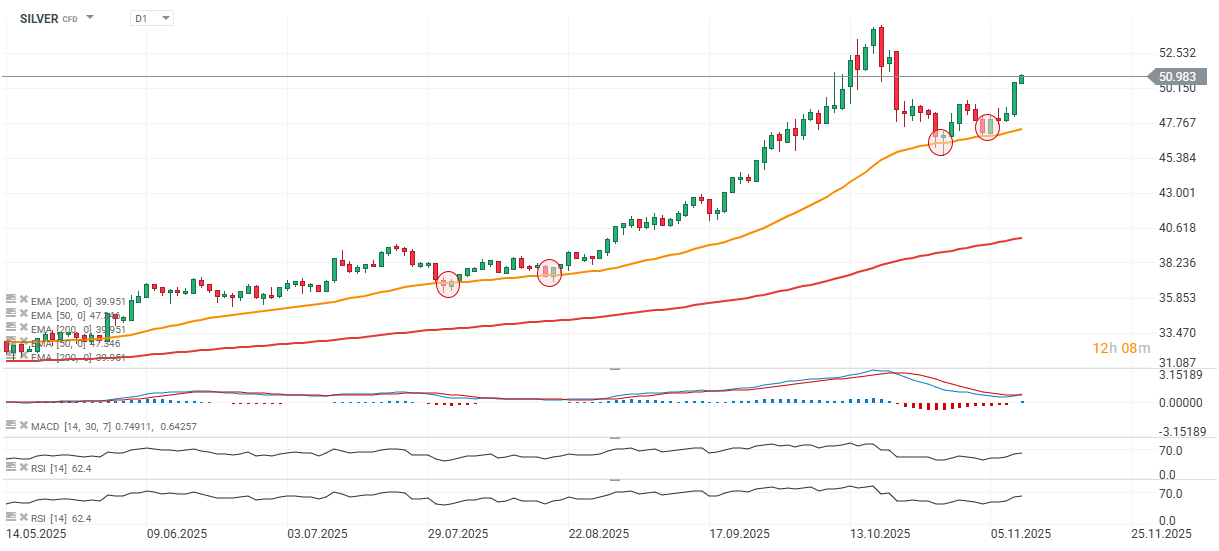 Silver is recovering from recent losses and has held above its 50-day exponential moving average (EMA50) (orange line) on the daily chart. This level, around 47.5 USD, now acts as key support. The most important resistance remains near 52.5 USD per ounce, where the last major downward impulse began.