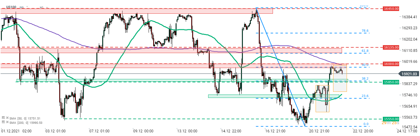 Wall Street indices managed to snap a losing streak yesterday and finished trading higher. Nasdaq-100 (US100) was one of the top performers gaining 2.3%. Tech index bounced off the lows from December 3 (15,550 pts)at the beginning of this week and launched a recovery move. A double bottom pattern surfaced on the chart and 16,400-16,450 pts area can be treated as the neckline. Breaking above could trigger a 900-points upward move (textbook range of the breakout from the pattern). However, the recovery move was halted at the resistance zone marked with 50% retracement of a recent drop, 200-hour moving average (purple line) and psychological 16,000 pts level. Index is pulling back at press time and if declines deepen, a test of the near-term support at 38.2% retracement cannot be ruled out (15,850 pts area).