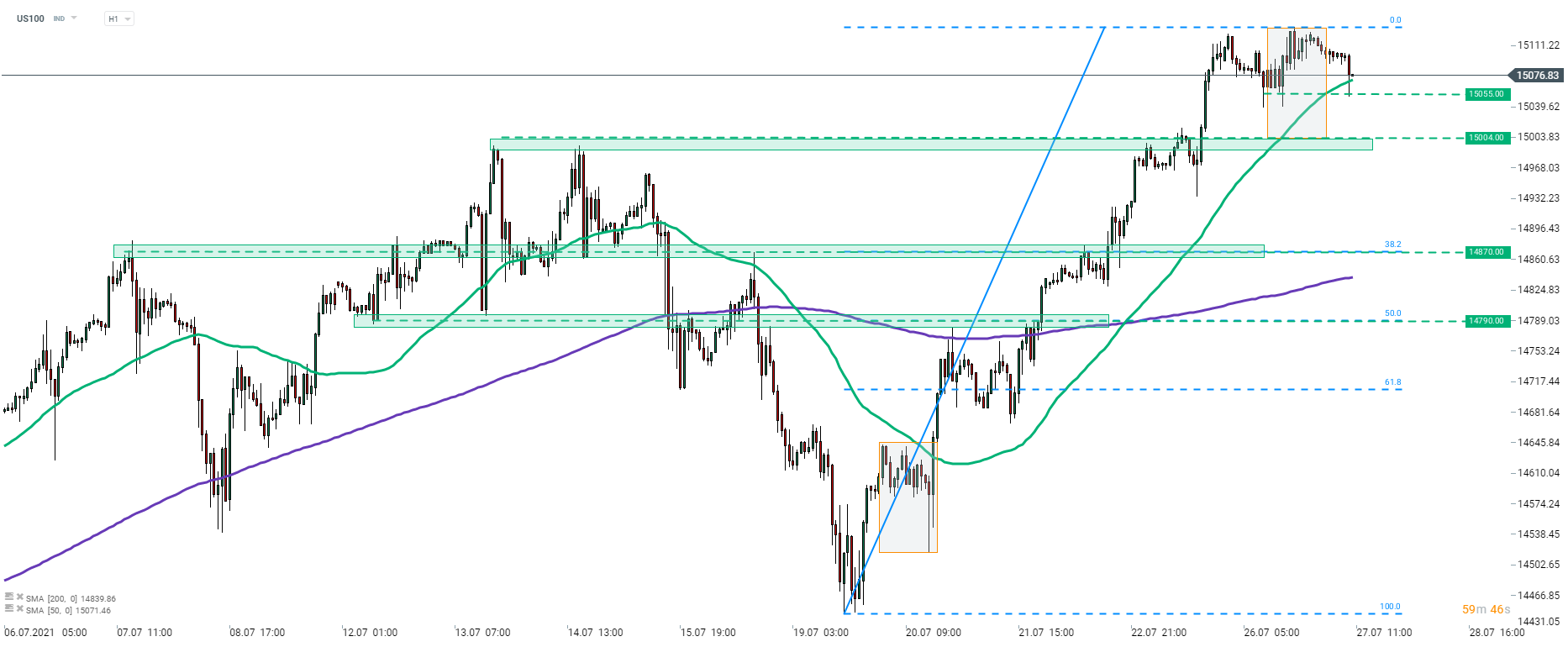 Taking a look at the US100 chart, that sell-off has been rather small so far (compared to Chinese indices for example). US100 is testing a 50-hour moving average (green line) in the 15,065 pts area. However, the main support to watch is located at 15,004 pts - the lower limit of local market geometry. Dropping below this hurdle could see a downward move accelerate. In such a scenario next support levels to watch can be found at 38.2% retracement of upward move launched in mid-July (14,870 pts) as well as 50% retracement (14,790 pts).