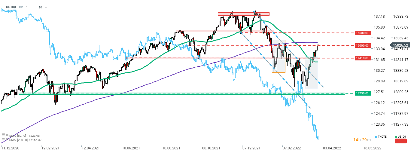 Futures on the US Nasdaq-100 index (US100) reached 15,000 pts this morning. This is the highest level since February 9, 2022 and has more than recovered all of the losses made since the beginning of the Russian invasion of Ukraine. Markets are increasingly looking past the Russia-Ukraine war after an initial period of turmoil. However, it looks like equity markets are also looking past the situation on the bond market. US100 and other tech indices have been quite reactive to changes in bond yields in the past with rising yields (falling bond prices) putting pressure on stocks. As one can see on the chart below, this correlation of US100 and TNOTE (10-year US bond price) have broken down two weeks ago, ahead of the FOMC meeting. Resulting discrepancy is quite large but it is unknown which market will adjust to which, or whether they will adjust at all. Nevertheless, continued increase in borrowing costs is likely to trigger some repricing on the stock markets sooner or later. In case bulls manage to sustain the break above 15,000 pts handle, the 200-session moving average in the 15,150 pts area (purple line) and 15,600 pts swing area will be the levels to watch.