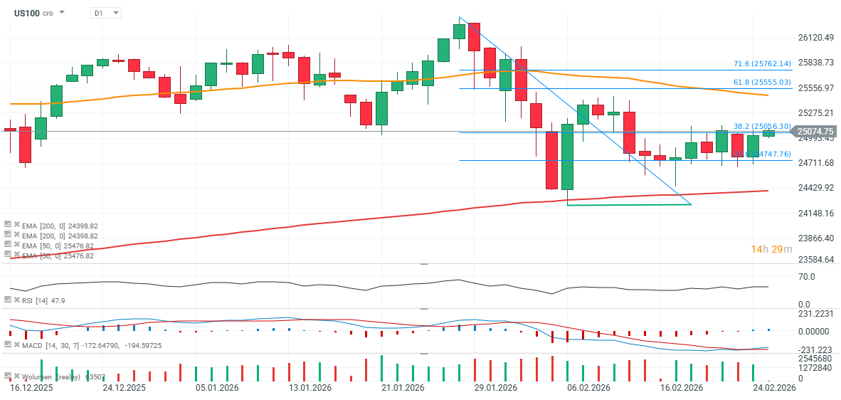 - The index is currently trading near the 38.2% Fibonacci retracement of the most recent downside impulse. A sustained break above this level—and a move through 25,150—could open the way toward 25,550, where the 61.8% retracement sits. That said, it is difficult to expect a decisive move before Nvidia publishes its results.