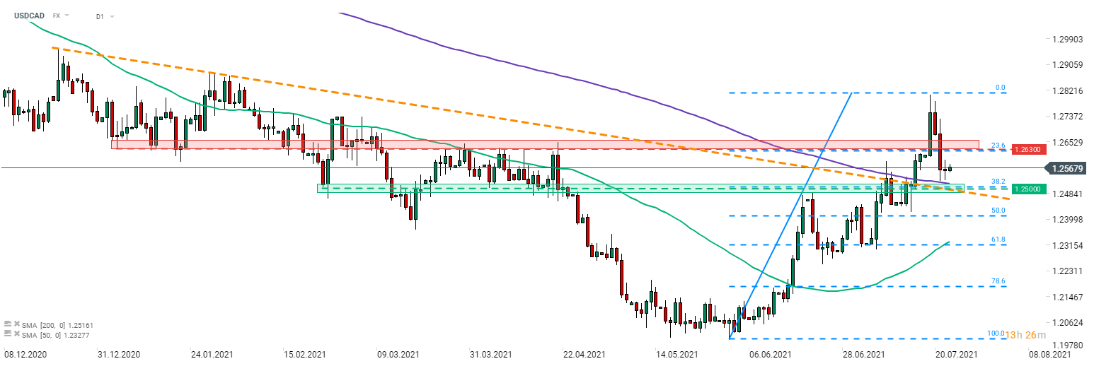 Taking a look at USDCAD chart at D1 interval, we can see that the pair has pulled back from a recent 6-month high. However, a drop was halted at the 1.25 support area. This zone is marked with previous price reactions, 38.2% retracement of recent upward impulse, 200-session moving average as well as the earlier-broken downward trendline. Positive price reaction to a mix of technical support may hint that uptrend is about to resume. The first near-term resistance to watch can be found in the 1.2630 area (23.6% retracement).