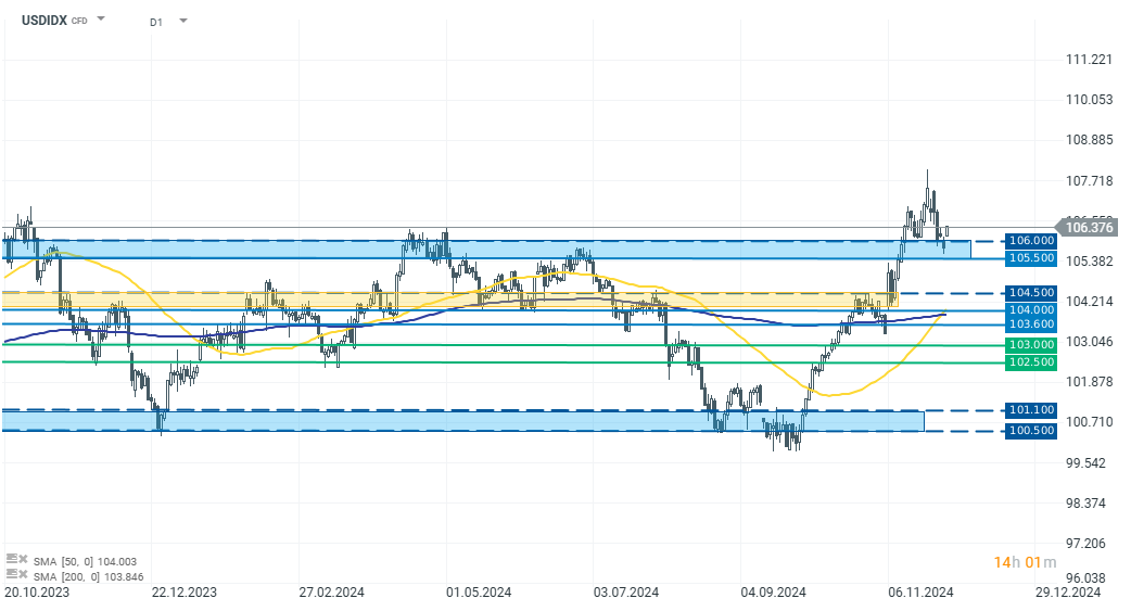 The U.S. dollar is gaining 0.54% today, reaching 106.3800 points. A strong dollar is driving an increase in U.S. bond yields, a slight decline in equity index futures, and a sell-off in the cryptocurrency market. The rise in the dollar's value is likely influenced by Donald Trump's comments about the idea of introducing a new currency under the BRICS collaboration framework. BRICS currently includes China, Russia, Brazil, India, South Africa, Iran, Egypt, Ethiopia, and the United Arab Emirates. Trump stated that if these countries continue their work on introducing a common currency and moving away from the USD, they must face the risk of 100% tariffs.