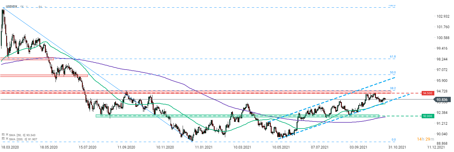 A look at the US dollar index (USDIDX) at daily interval shows that the index halted downward move ahead of the upward trendline and started to recover. Today's GDP release will surely be taken into consideration by Federal Reserve when it announces decision next week. While taper announcement this year looks like a done deal, a solid release will cement expectations on announcement in November. The major near-term resistance zone for USDIDX ranges between 94.50 and 38.2% retracement of downward move started in late-Q3 2020 (94.75). In case of a break above, the next important resistance can be found near 50% retracement (96.50).