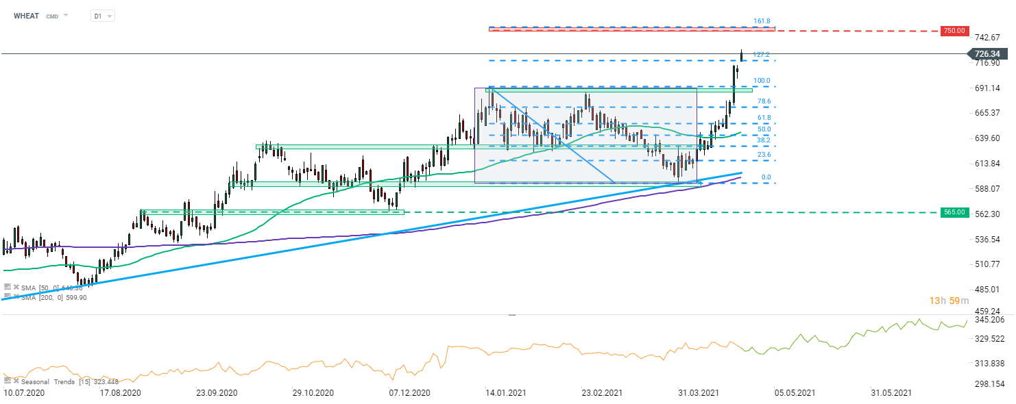 Taking a look at WHEAT from a technical point of view, we can see that the price jumped above 127.2% exterior retracement of a recent correction today. Seasonal patterns hint that the local peak is still ahead. Should the upward move continue the nearest resistance some to watch can be found ranging between $750 and 161.8% exterior retracement.