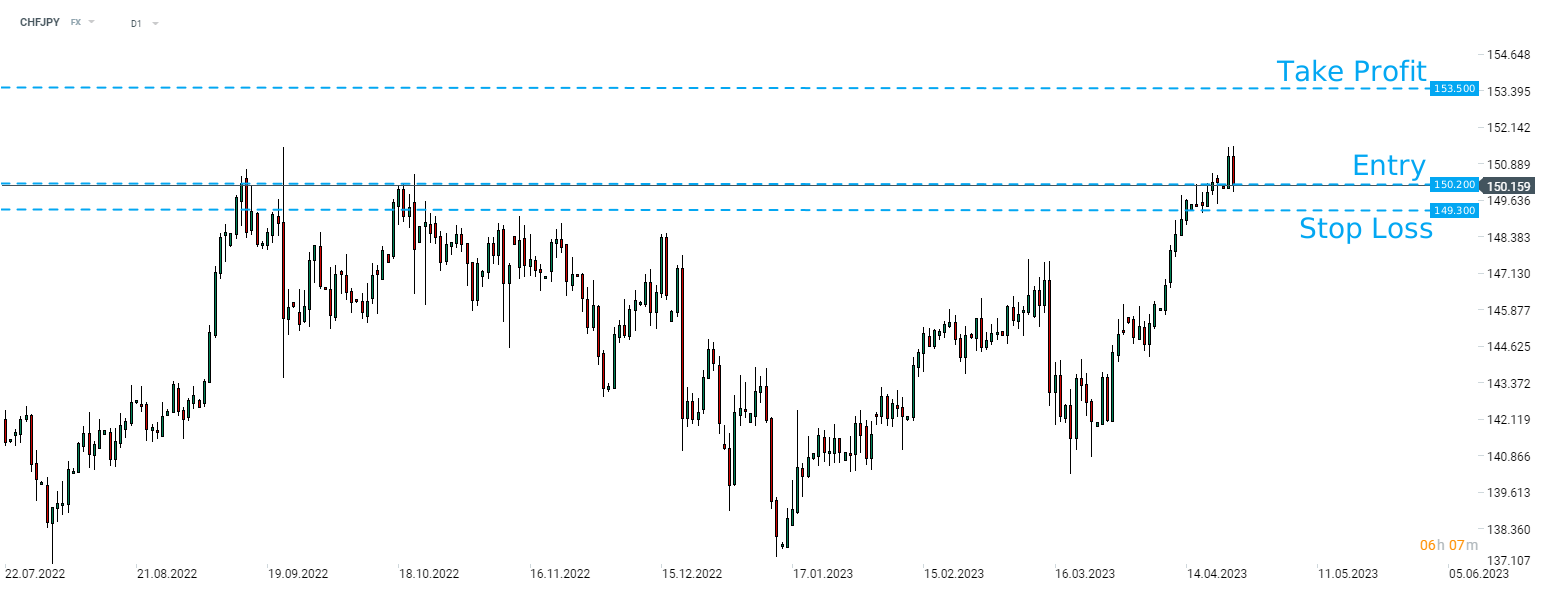 RBC recommends taking a long position on CHFJPY with a target of 153.50 and a stop loss order at 149.30. Source: xStation5