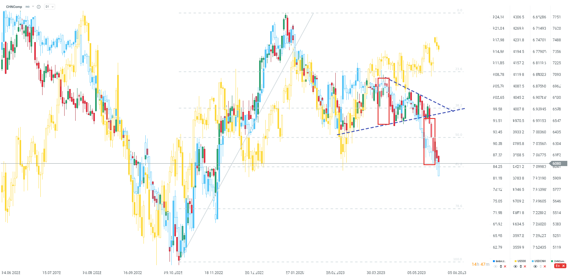 CHNComp strongly correlates with USDCNH, so the behavior of the dollar will be crucial for this index. CHNComp has broken out of a triangle pattern and is currently testing a significant support level, marked the 61.8% Fibonacci retracement of the entire upward impulse. On the other hand, if the US removes the debt limit and liquidity in the US financial sector begins to decrease, it cannot be ruled out that the divergence between CHNComp and US500 will narrow. Source: xStation5