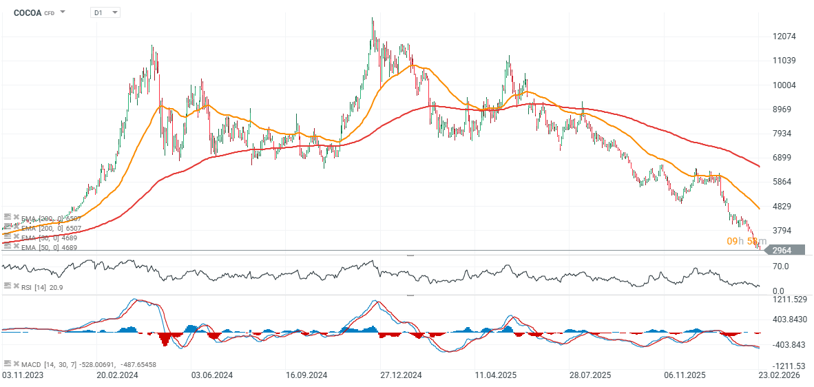 Cocoa futures (COCOA) on ICE slumped today, down more than 5% and falling below $3,000 per tonne - levels not seen since May 2023. The market is being hit by chronically weak physical demand, a sharp slowdown in processing, favourable weather across West Africa and the prospect of a strong harvest season, which is also weighing on returns for African farmers.