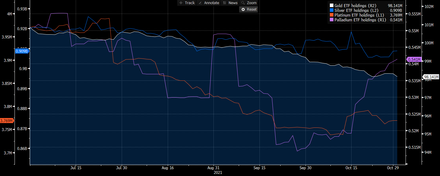 ETFs increased holdings of silver and palladium over the past week. Gold and platinum holdings decreased slightly. Source: Bloomberg
