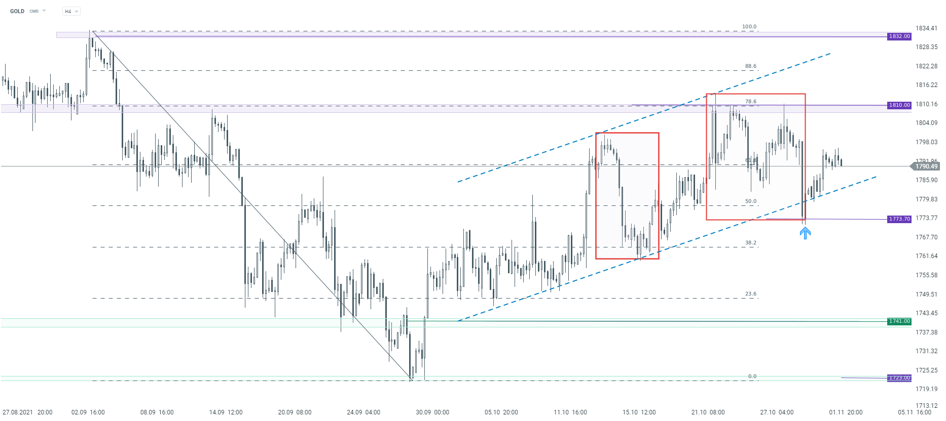 Gold dropped below $1,800 but found a support at the lower limit of the market geometry. Precious metal has climbed back into the upward channel later on and reached $1,790 area. Gold trades sideways this week as investors seem to be in a 'wait-and-see' mode ahead of FOMC meeting on Wednesday. Source: xStation5
